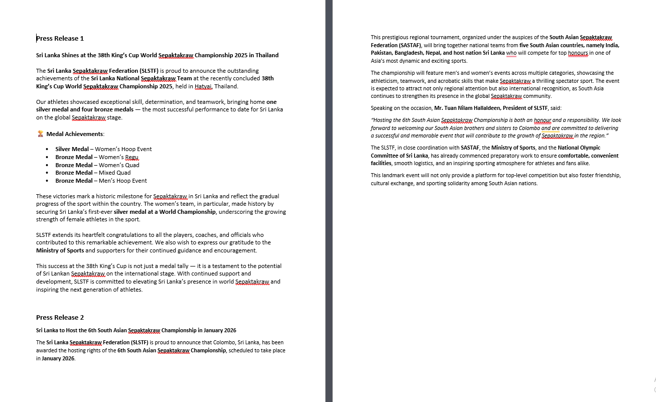 Following Sri Lanka’s record-breaking performance at the 38th King’s Cup World Sepaktakraw Championship 2025, multiple sports media outlets and online platforms across Asia reported the achievement. Local and regional headlines celebrated the women’s team’s historic silver medal, alongside four bronze finishes, symbolizing a new chapter in Sri Lankan Sepaktakraw excellence.